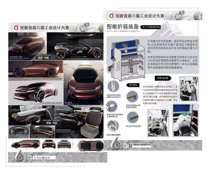 最終,來(lái)自奇瑞汽車(chē)的E-IUV概念車(chē)(概念設(shè)計(jì))與安徽聯(lián)盟模具工業(yè)有限公司的基于無(wú)線射頻識(shí)別的智能折彎裝備( 實(shí)物產(chǎn)品)榮獲本次大賽金獎(jiǎng),從設(shè)計(jì)理念、產(chǎn)品外形、先進(jìn)技術(shù)在產(chǎn)品中的應(yīng)用以及解決行業(yè)痛點(diǎn)等關(guān)鍵問(wèn)題上,以上作品在行業(yè)中均處于領(lǐng)先水平。同時(shí),來(lái)自順榮股份、三只松鼠、美的冰箱、中車(chē)龐巴迪(蕪湖)、安徽工程大學(xué)、安徽工業(yè)大學(xué)等企業(yè)、高校投稿作品也在本次大賽中取得了優(yōu)異的成績(jī)。